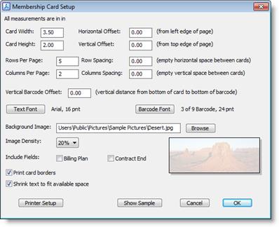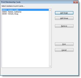 Gym Assistant can print membership cards for members, either one at a time on single sheets of paper or as a batch with multiple cards on one sheet.
