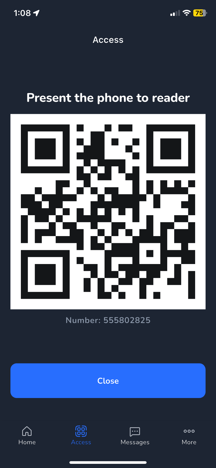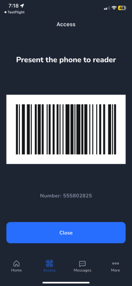 - Secure Access: The Access button generates a dynamic QR code or barcode that can be scanned by your Gym Assistant Access Mobile Reader or Check-In Barcode Scanner. A new code is created every time, preventing credentials from being shared.